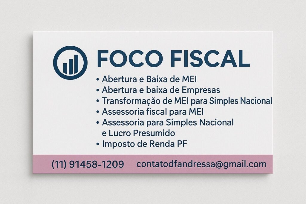 CONTABILIDADE FISCAL ESPECIALIZADA Segurança, economia e tranquilidade para sua empresa Você sente dificuldade em entender impostos, cumprir prazos ou acompanhar as mudanças da Reforma Tributária?👉 Deixe isso com quem entende. 🔹 O que oferecemos:✔ Apuração correta de impostos✔ Conformidade fiscal e entrega de obrigações✔ Planejamento tributário para reduzir riscos e custos✔ Orientação atualizada sobre a […]